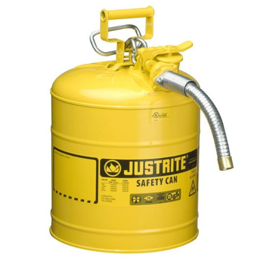 Made from high-grade coated steel, each can is pressure tested to ensure quality. The tough powder-coat finish resists chemicals and stands up to demands of rigorous use. Stainless steel flame arrester—equipped in all Justrite safety cans—dissipates heat to stop flashback ignition. Sealed lid features automatic positive-pressure relief that vents between 3 and 5 psig (0.2 and 0.35 bar) to protect against explosion. Large label ID zone provides writing space to identity contents, department location, or individual user name. All can sizes have extra capacity for adding two-cycle engine oil or other additives.